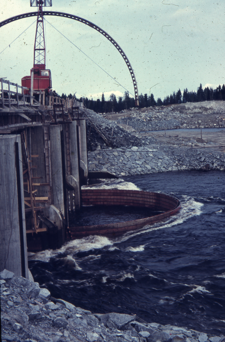 Titel: Arbetsbilder från vattenrallare Egon Frisk, byggnation av troligtvis en kraftverksdamm i ett vattendrag.