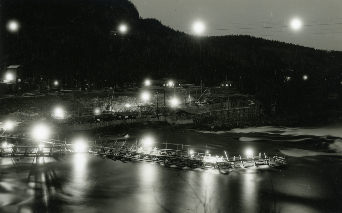 Arbetsbilder från vattenrallare Egon Frisk. Bygge av vattenkraftverk i Krångede, upplyst av lycktor.