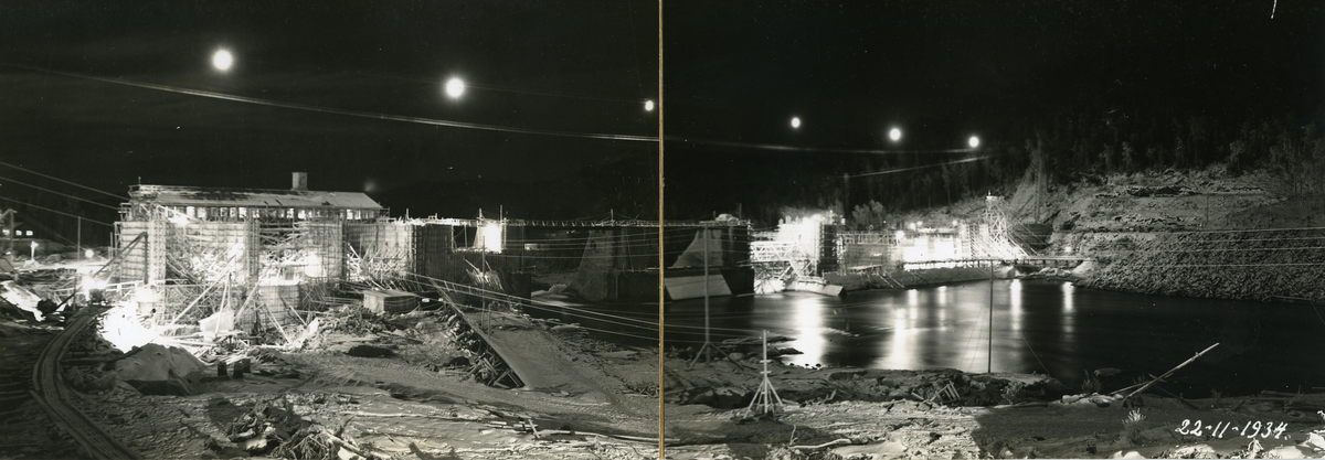 Arbetsbilder från vattenrallare Egon Frisk. Bygge av vattenkraftverk i Krångede, upplyst av lycktor.