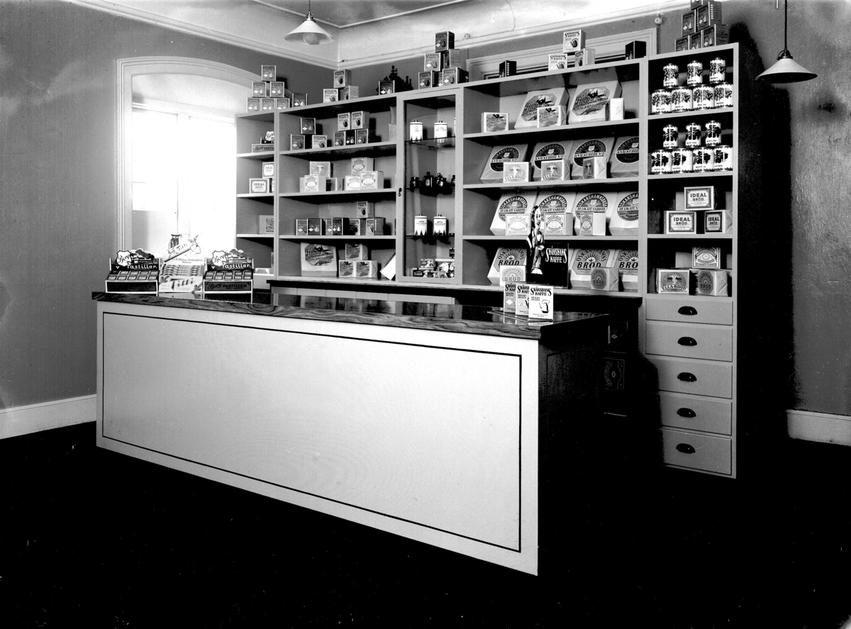 Butikshylla och butiksdisk. Enligt Walter Olsons journal är bilden beställd av Kalmar handelsinstitut.