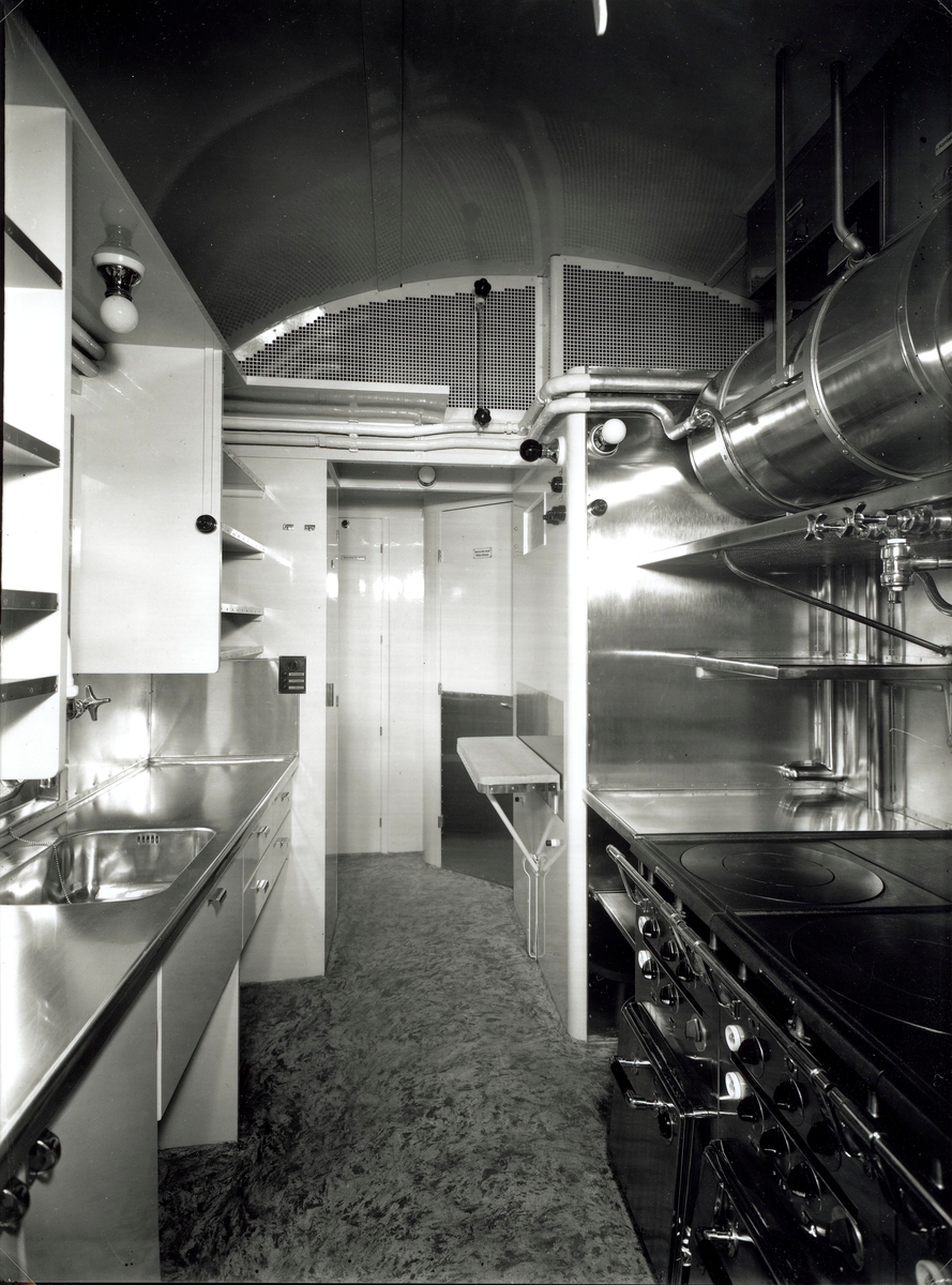 Interiör från köket på en restaurangvagn tillverkad på Kalmar Verkstads AB.