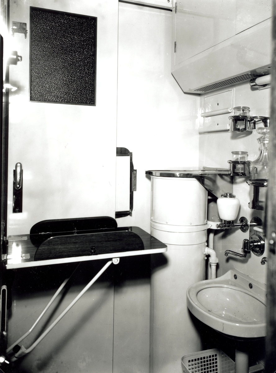 Interiör av ett toalettutrymme på en tågvagn, som är tillverkad av Kalmar Verkstads AB.