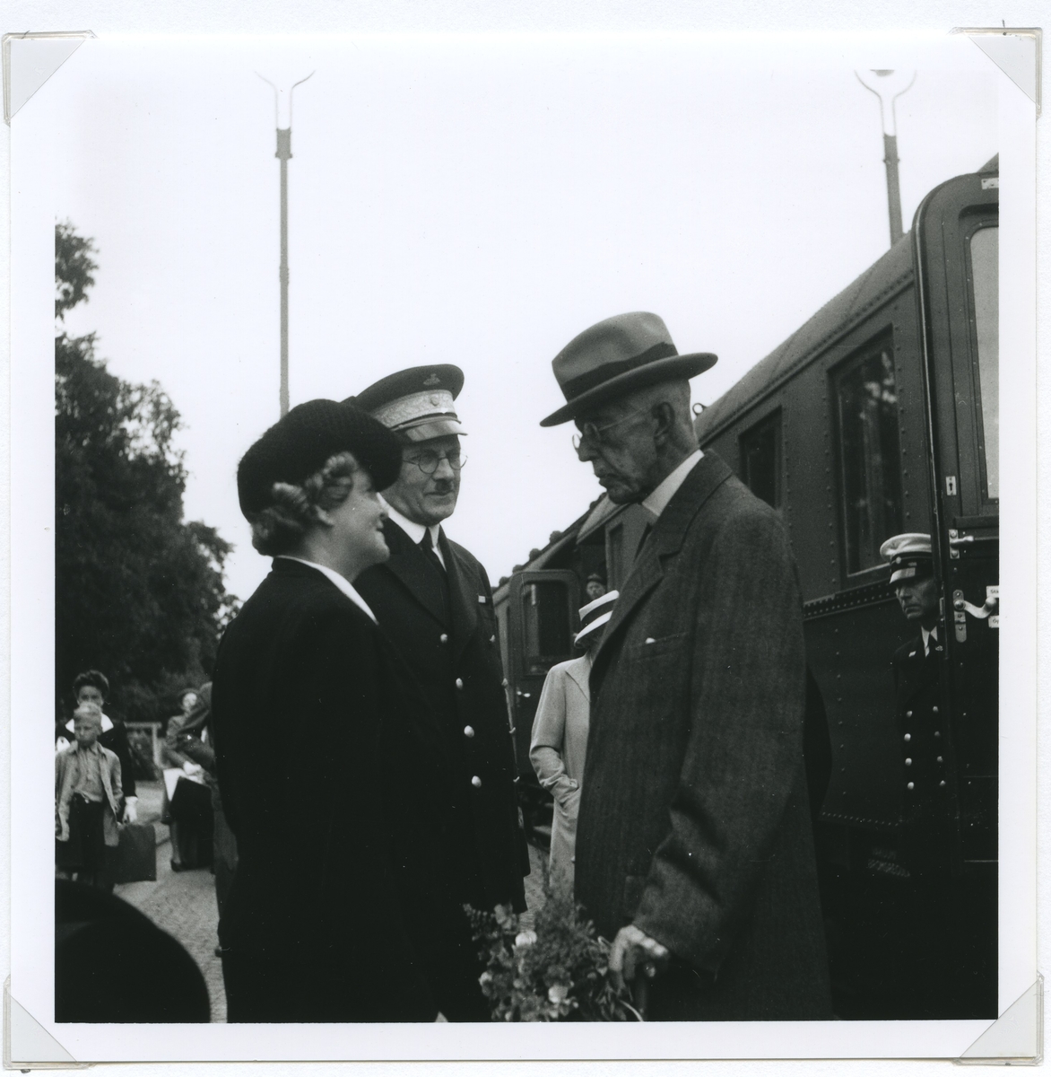 Konung Gustav V samtalar med landshövdingeparet Arvid och Ester Lidén.