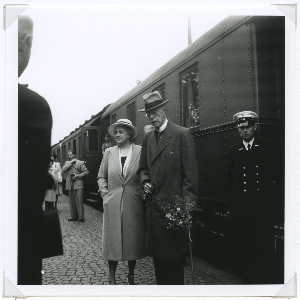 Konung Gustav V flankeras av Sigrid Sellgren, född Jeansson.