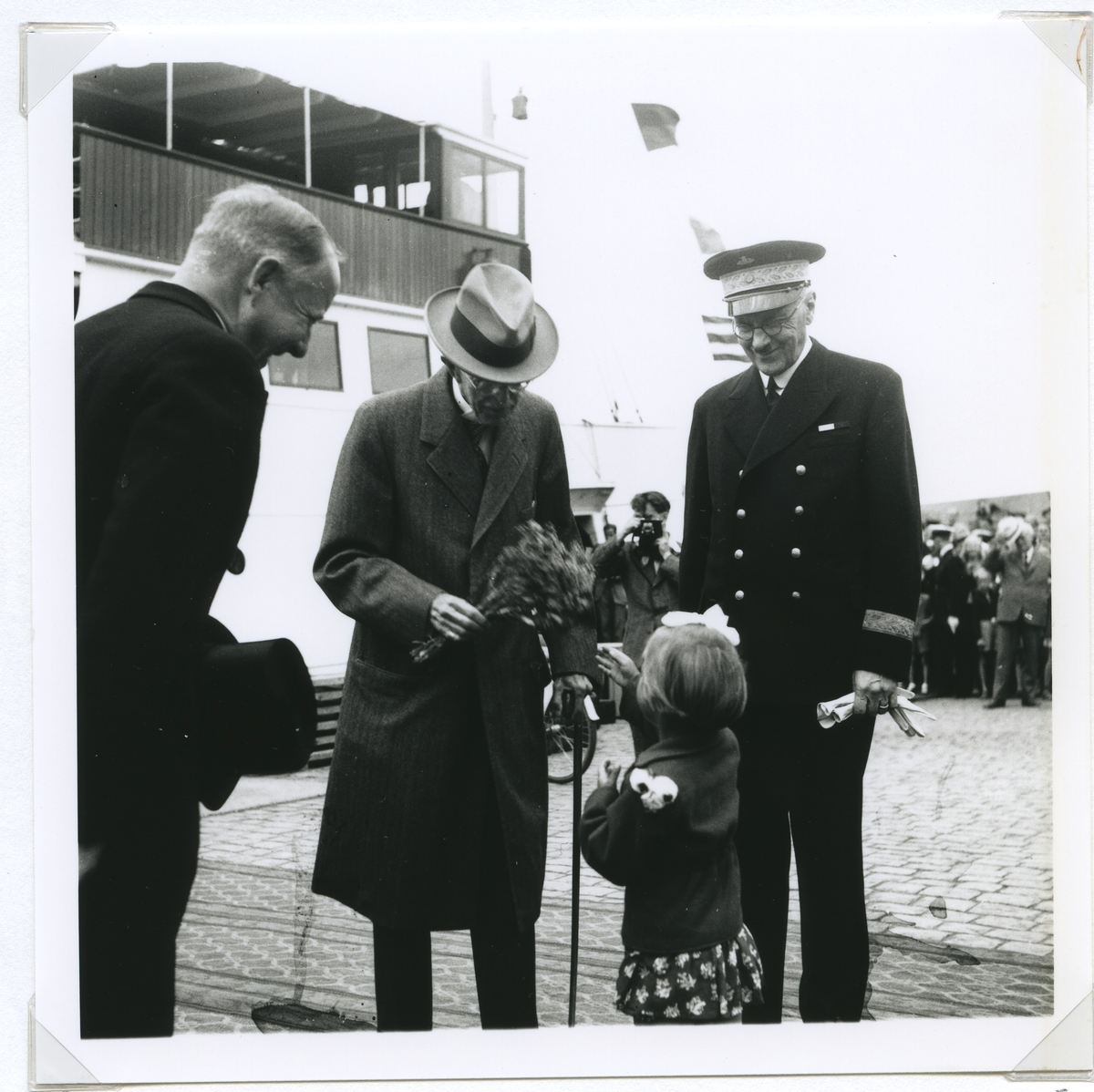 Konung Gustav V blomsteruppvaktas av en liten medborgare, flankerad av borgmästare Yngve Malmquist (till vänster) och landshövding Arvid Lidén på Ölandskajen.