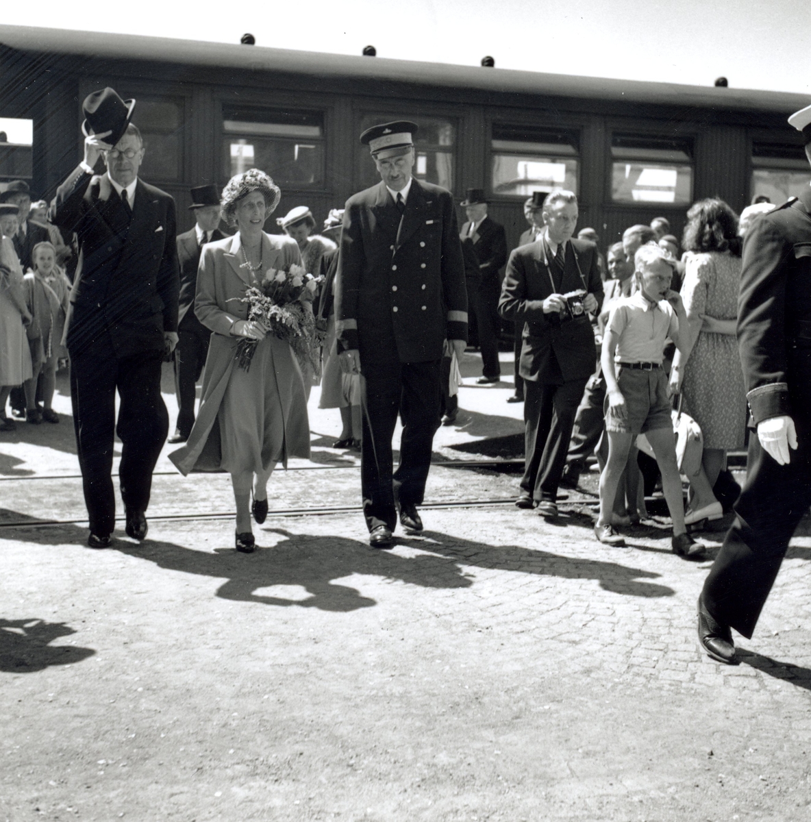 Kronpris Gustaf Adolf hälsar folket. Landshövding Arvid Lidén flankerar kronprinsessan Louise. Yngve Malmquist i bakgrunden.