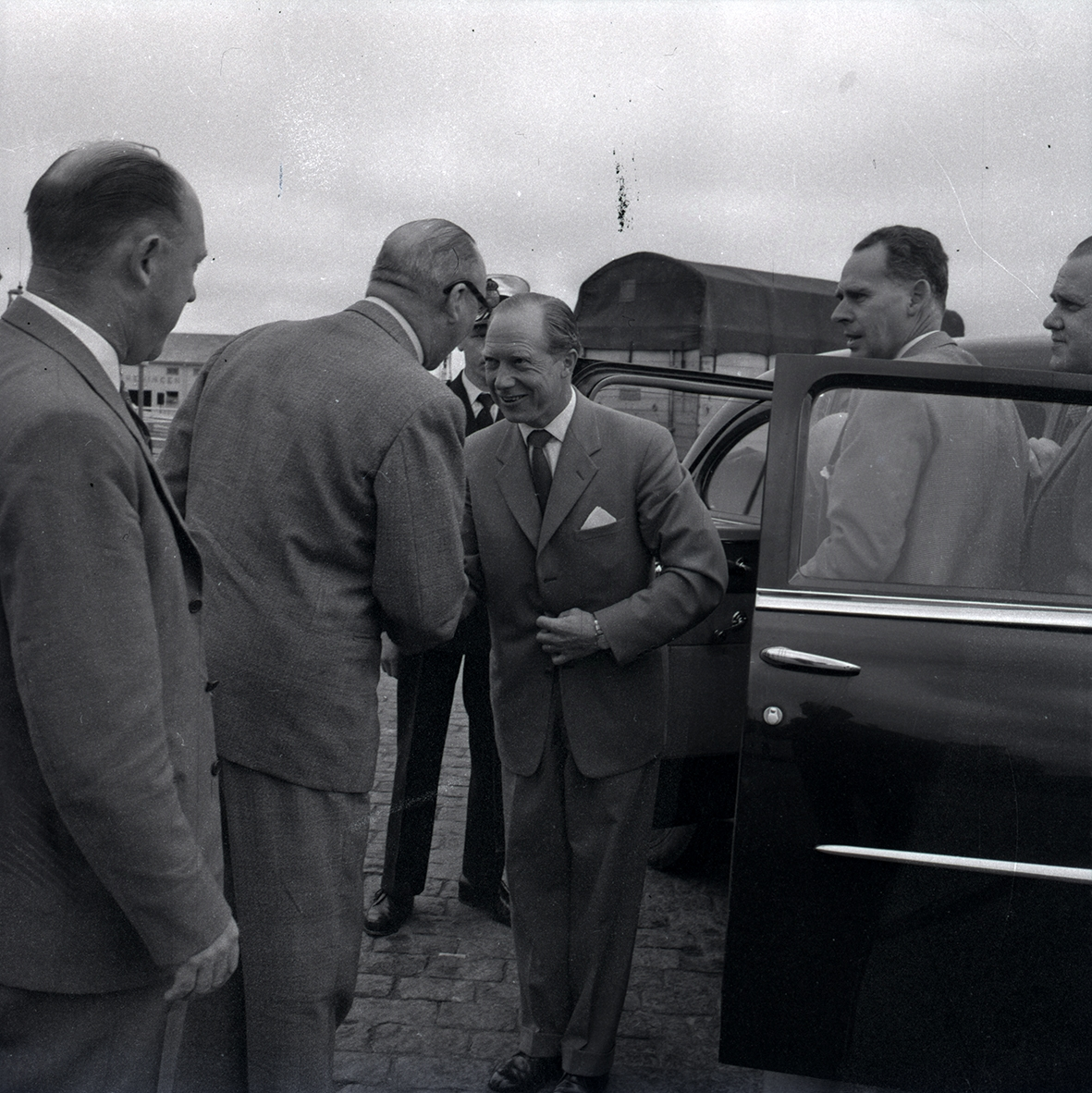 Statsrådet Eliasson skakar hand i mitten.