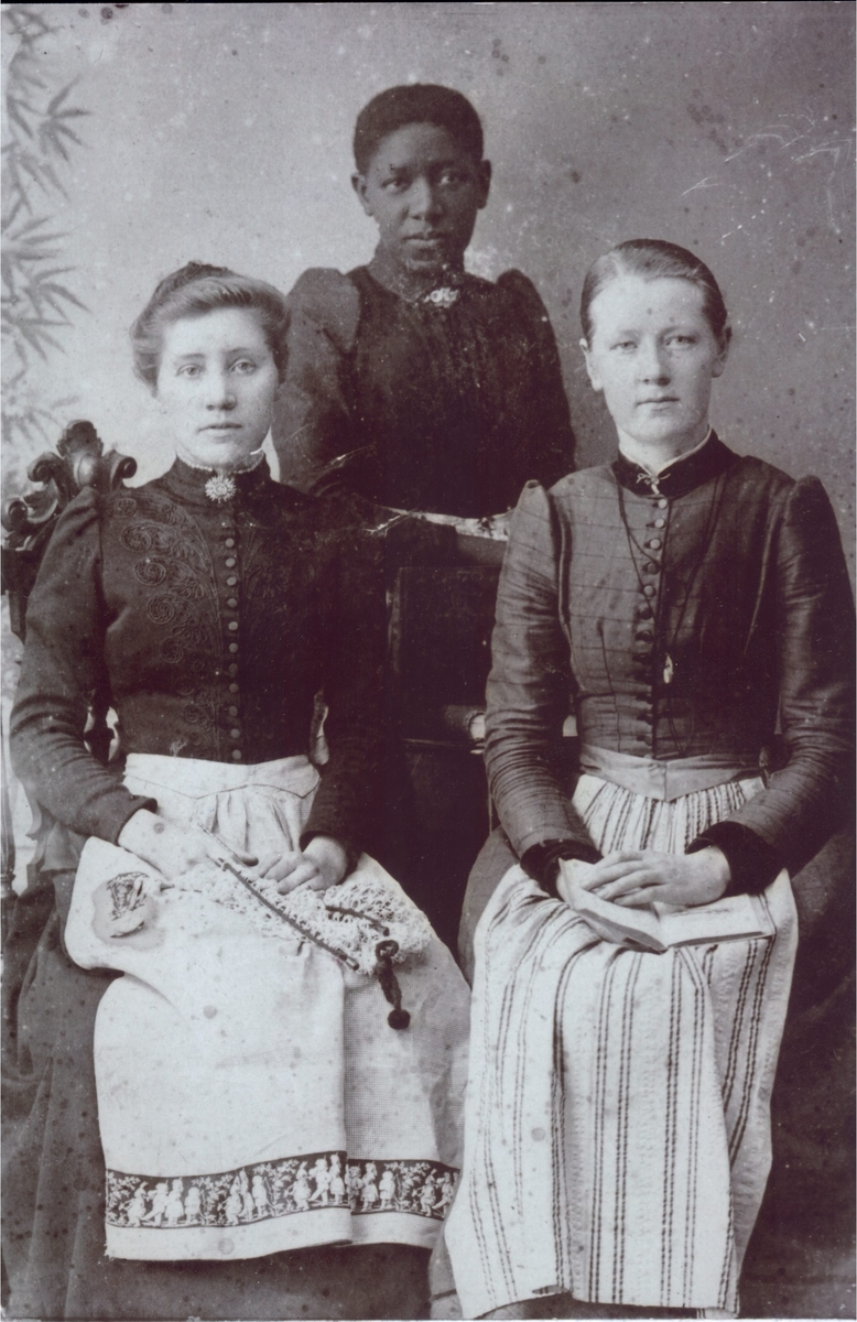Emmelie "Millan" Boy tillsammans med två vita kvinnor. Millan var dotter till Svarta Sara som kom till Kalmar med den forsmannska expeditionen. Hon levde hela sitt liv (1863-1900) i Kalmar och verkade som musiklärare.