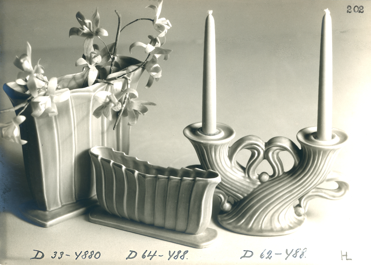 Vas, blomskål och ljusstake från Bo Fajans, formgivare Ewald Dahlskog, tidigt 1900-tal. Fotografiet är märkt med fotografens signatur i blyerts.