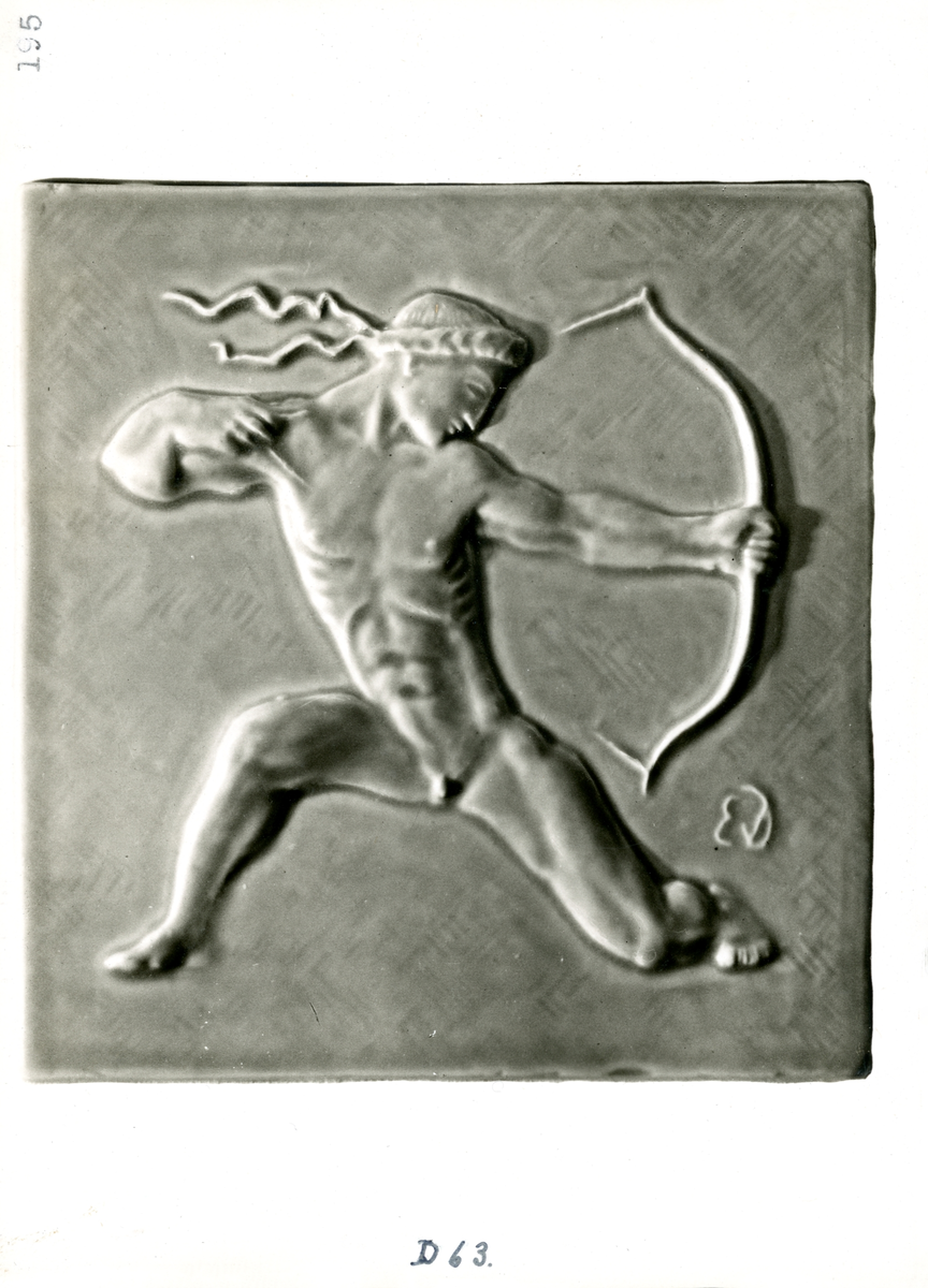 Väggplatta "Bågskytt" från Bo Fajans, formgivare Ewald Dahlskog, tidigt 1900-tal.