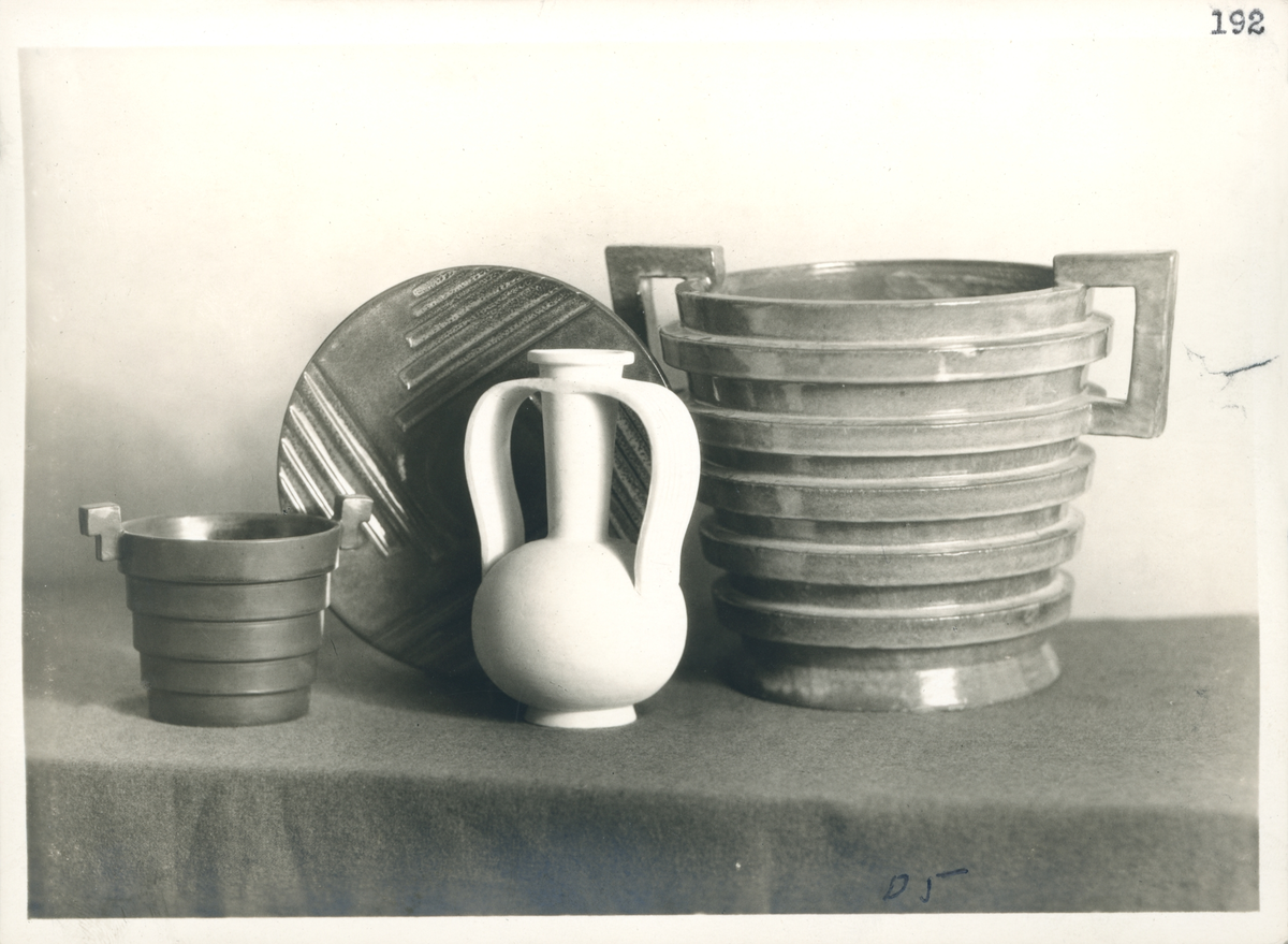 Pressbild till Stockholmsutställningen 1930. Vaser, krukor och fat från Bo Fajans, formgivare Ewald Dahlskog, tidigt 1900-tal.