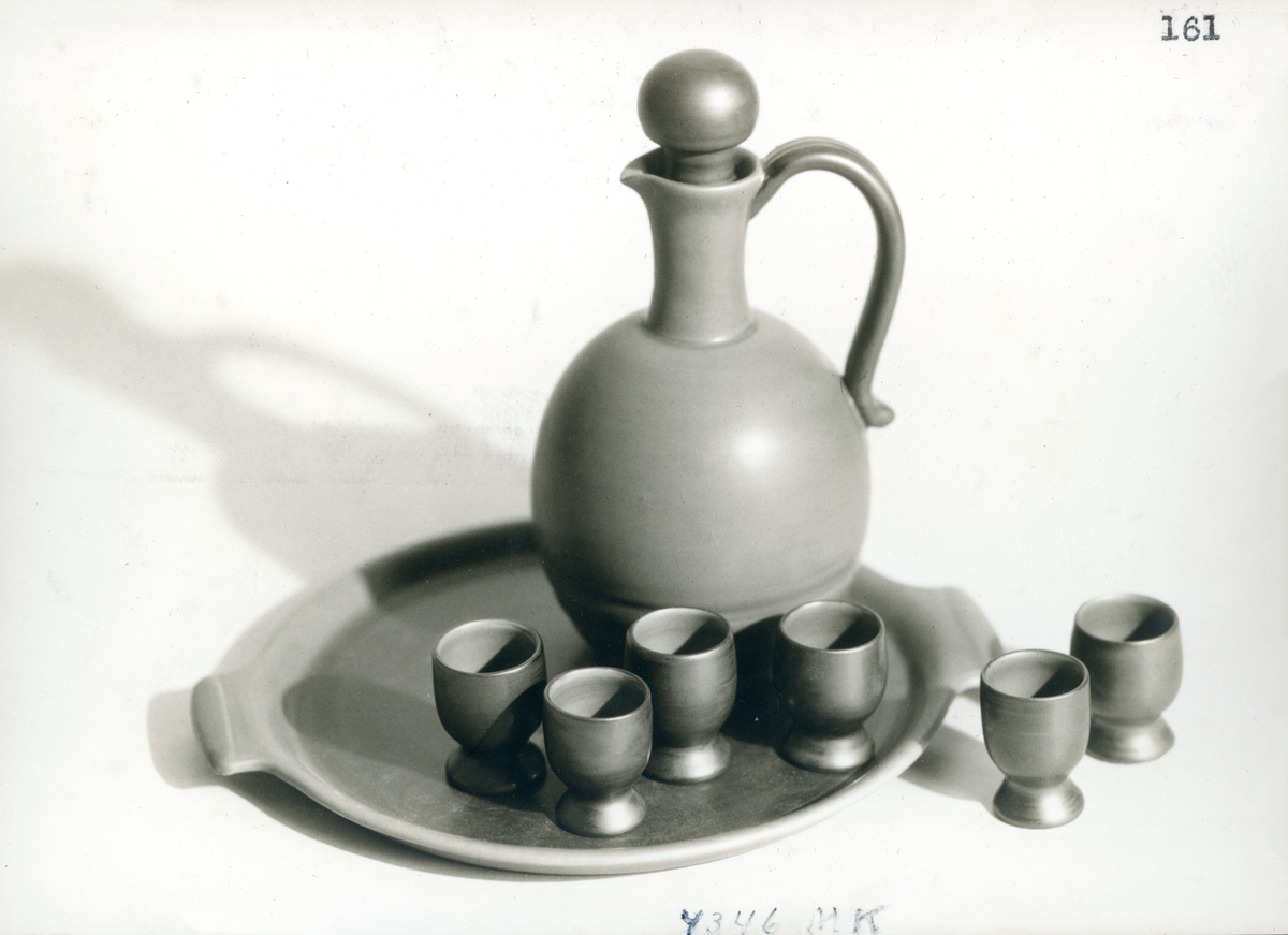 Likörkrus med serveringsfat och koppar från Bo Fajans, formgivare Eva Jancke-Björk, tidigt 1900-tal.