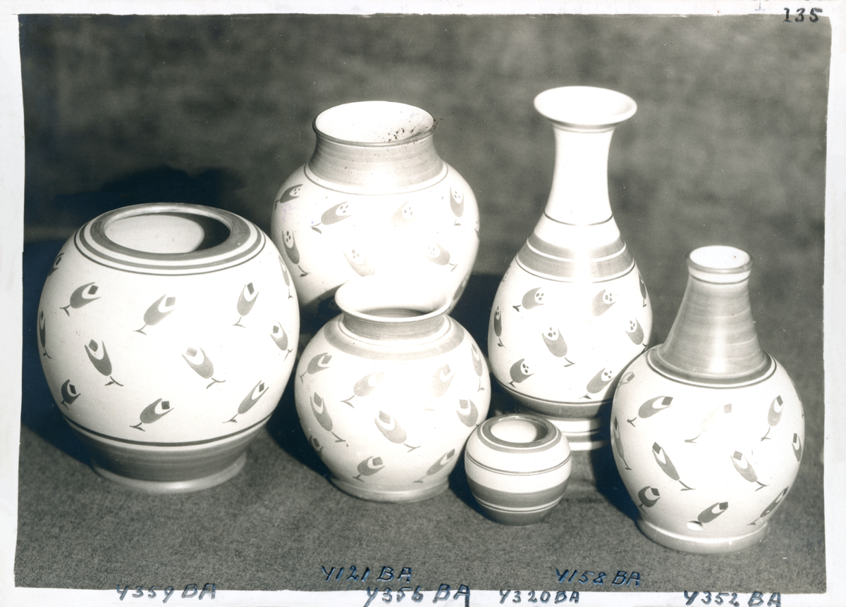 Vaser och en lampfot från Bo Fajans, formgivare Eva Jancke-Björk, tidigt 1900-tal.
