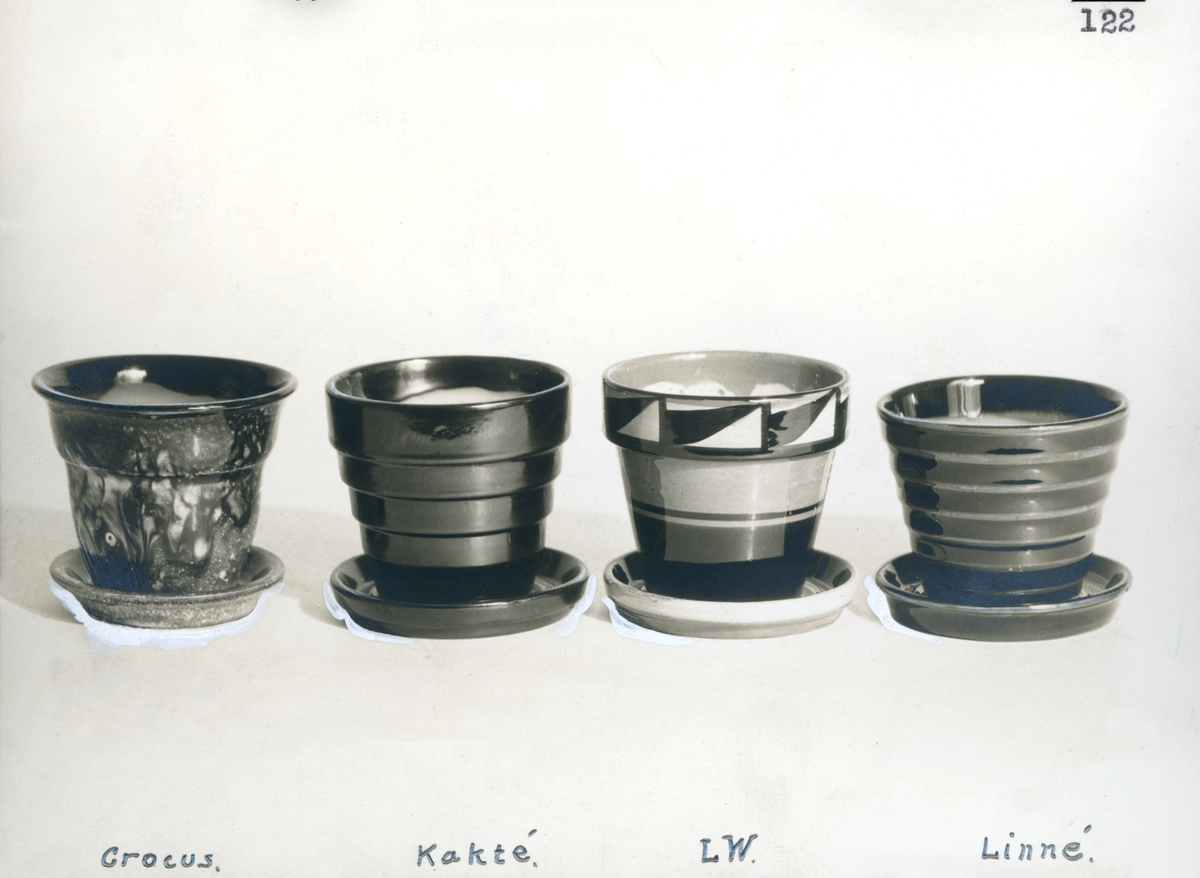 Krukorna "Crocus", "Kaktè, "LW" och "Linnè" från Bo Fajans, formgivare Gabriel Burmeister (Crocus) och Ewald Dahlskog (övriga tre), tidigt 1900-tal.