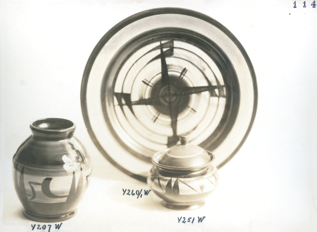 Fruktfat, vas och marmeladburk från Bo Fajans, formgivare Maggie Wibom, tidigt 1900-tal.