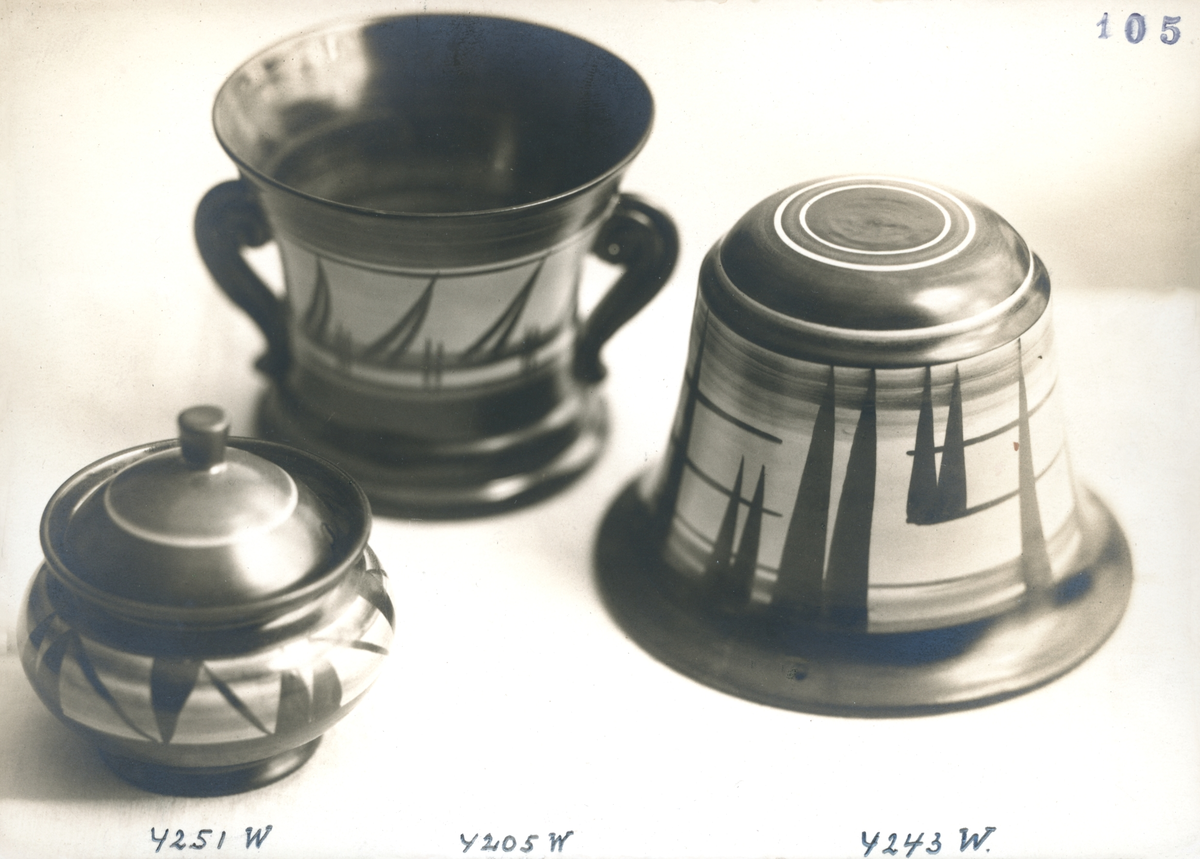 Krukor och en skål med lock från Bo Fajans, formgivare Maggie Wibom, tidigt 1900-tal.