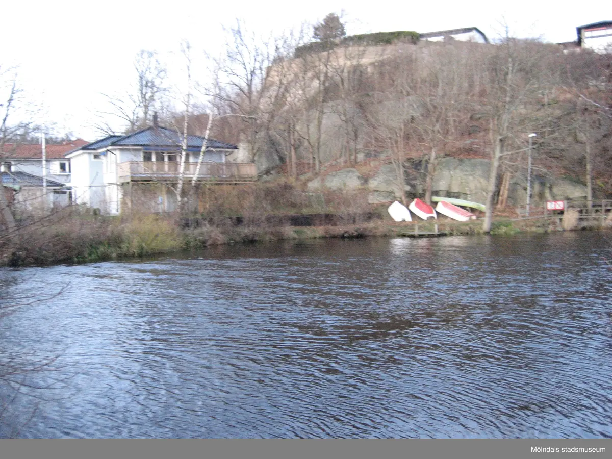 Ståloppet mellan Rådasjön och Stensjön, Mölndal år 2011. Villorna till vänster ligger på John Halls väg. Nedanför bergsknallen ligger några ekor uppdragna på land. Dokumentation inför ombyggnation.