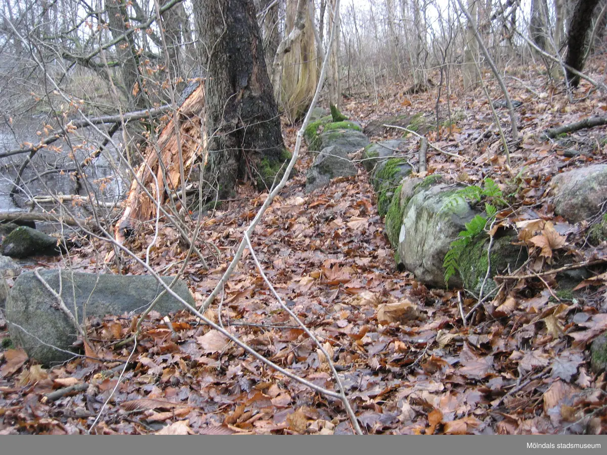 En slänt med träd, höstlöv och uppradade stenar ner mot Mölndalsfallen i Grevedämmet, Mölndal år 2011. Stensjön skymtas i bakgrunden till vänster. Dokumentation inför ombyggnation. Relaterade motiv: 2024_1365 - 1412.