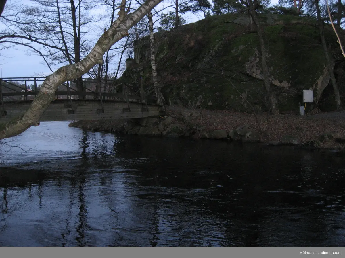 En liten gångbro över Ståloppet mellan Rådasjön och Stensjön, Mölndal år 2011. I förgrunden ses en björk som hänger ner över vattnet. Till höger ligger en bergsknalle. Dokumentation inför ombyggnation.