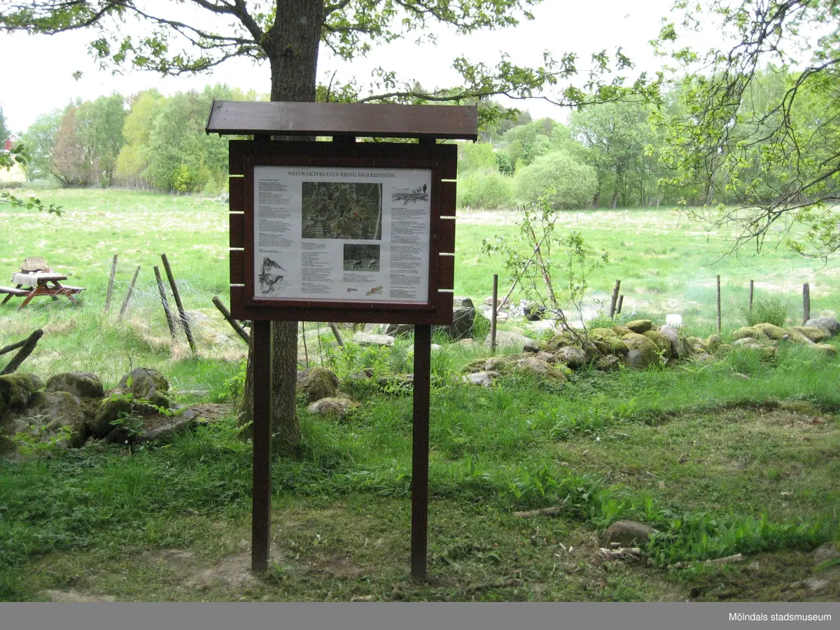 Invigning av Fagereds natur- och kulturstig i Lindome år 2008. En nyuppsatt skylt som beskriver stigen.