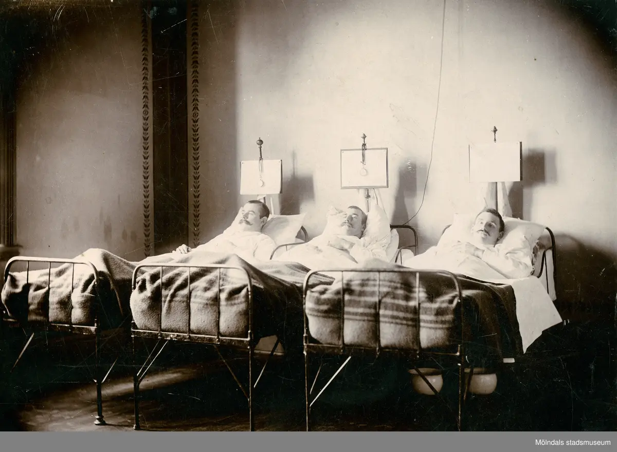 Tre män ligger i var sin sjuksäng, troligtvis i Gamla sjukstugan (1870-1923) på Norra Forsåkersgatan 19, okänt årtal. På sängarnas huvudgavel sitter var sin skylt uppsatt. En av männen är Adolf Andersson, född i Landvetter 1869-02-26, avliden av blodsjukdom 1922-04-19 (uppgift om ort saknas).