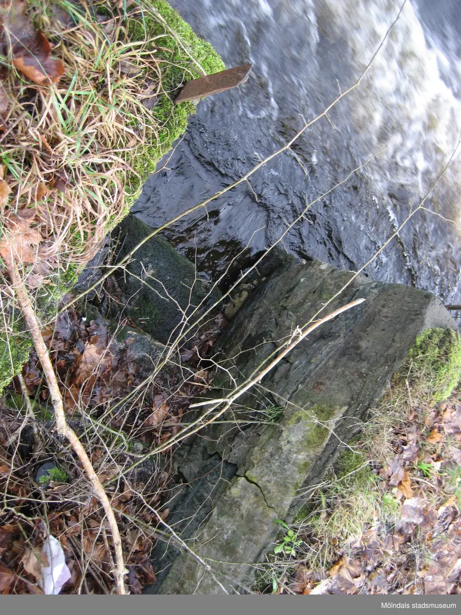 Närbild av inmurad trappa i stensättningen (se 2024_1382) som leder ner till forsen, Grevedämmet i Mölndal år 2011. Trappan är översållad av fallna löv. Dokumentation inför ombyggnation.