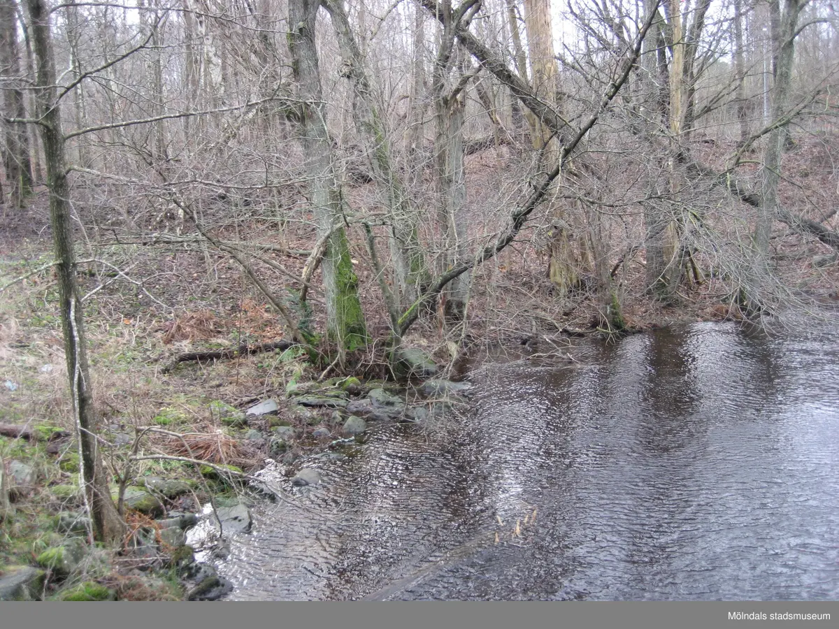 En slänt med träd, höstlöv och stenar i Grevedämmet, Mölndal år 2011. Vattensamlingen kommer från Stensjön som sedan rinner ner i Mölndalsfallen. Dokumentation inför ombyggnation. Relaterade motiv: 2024_1365 - 1412.