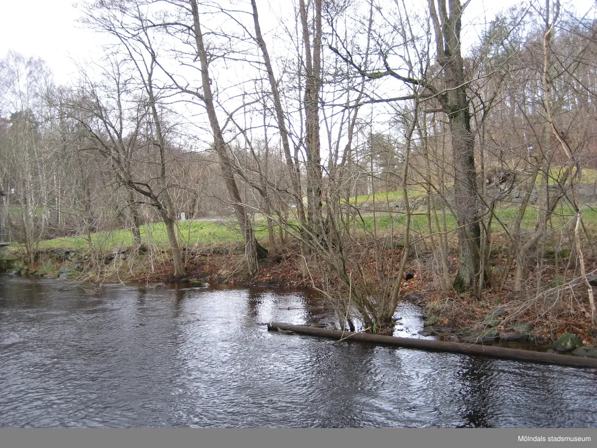 En stock flyter i forsen vid Grevedämmet, Mölndal år 2011. Vattensamlingen kommer från Stensjön som sedan rinner ner i Mölndalsfallen. Området är omgärdat av växtlighet. Dokumentation inför ombyggnation. Relaterade motiv: 2024_1365 - 1412.