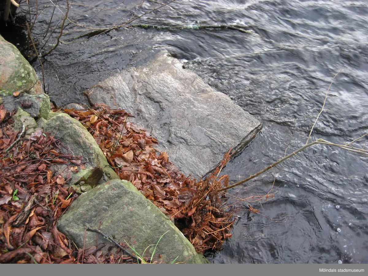 Mölndalsfallen och dess stensättning i höjd med parkeringen vid Pixbovägen 7, Mölndal år 2011. En något upphöjd sten ligger i forsen (se foto 2024_1375). Stenen ligger i lagom höjd att fiska ifrån. Dokumentation inför ombyggnation. Relaterade motiv: 2024_1365 - 1412.