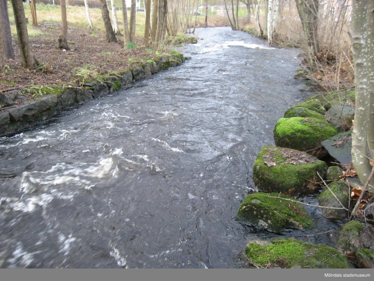 Vy åt sydväst över Mölndalsfallen, dess stensättning och träd vid Grevedämmet i Mölndal år 2011. Pixbovägen som ligger ovanför sluttningen ses ej i bild. Dokumentation inför ombyggnation.