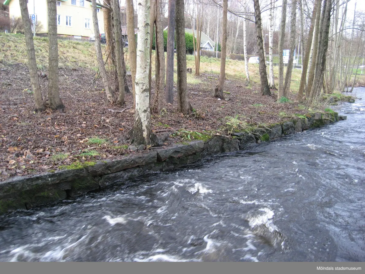 Vy västerut över Mölndalsfallen, dess stensättning och träd vid Grevedämmet i Mölndal år 2011. Bilar kör på Pixbovägen mot Mölndal. De tre villorna (från vänster) ligger på Sågdalsgatan 6, 4 och 2. Dokumentation inför ombyggnation.