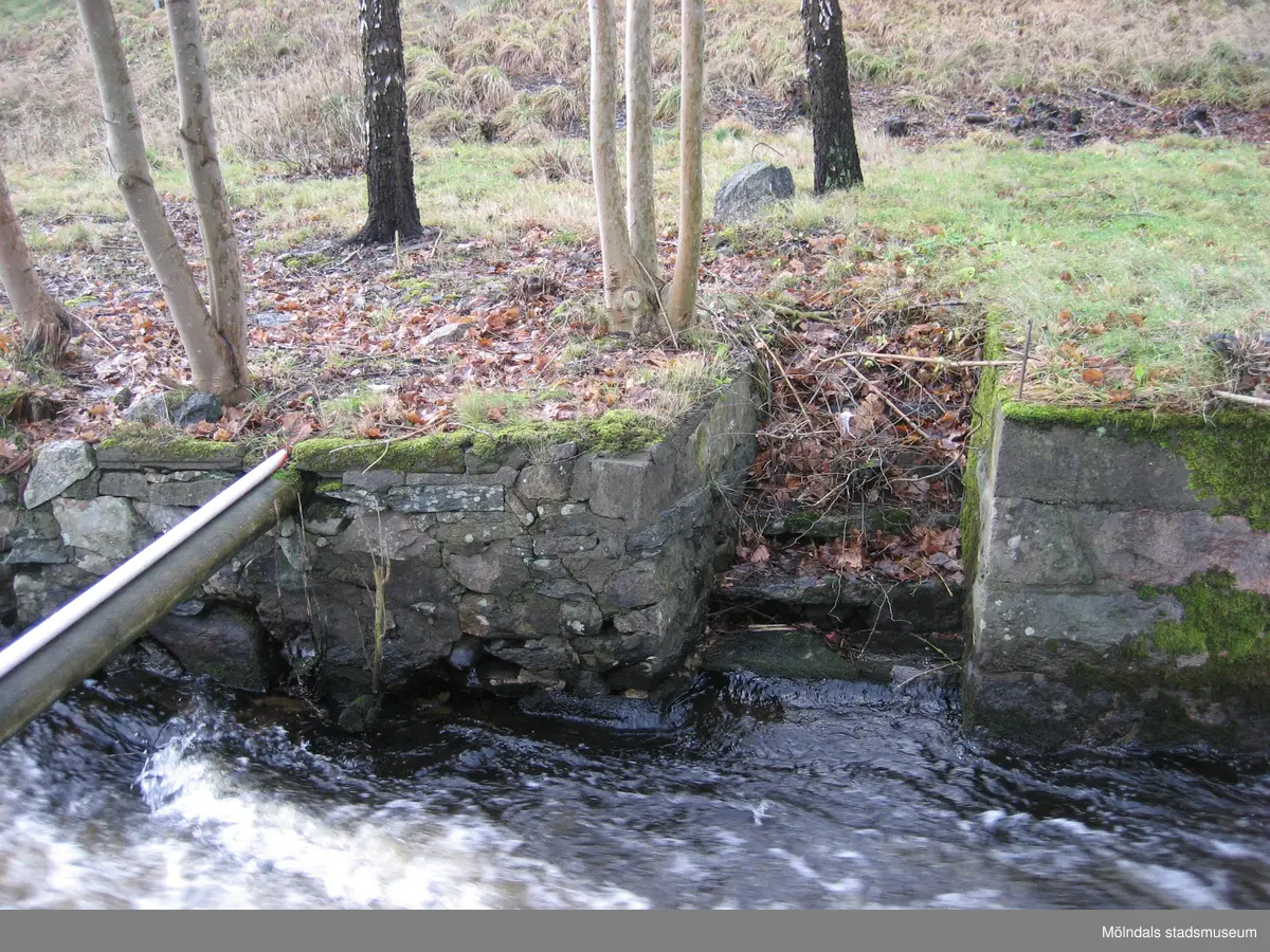 Vy västerut över Mölndalsfallen, dess stensättning och träd vid Grevedämmet i Mölndal år 2011. En liten infasad trappa leder från forsen upp mot slänten. Pixbovägen som ligger ovanför ses ej i bild. Dokumentation inför ombyggnation.
