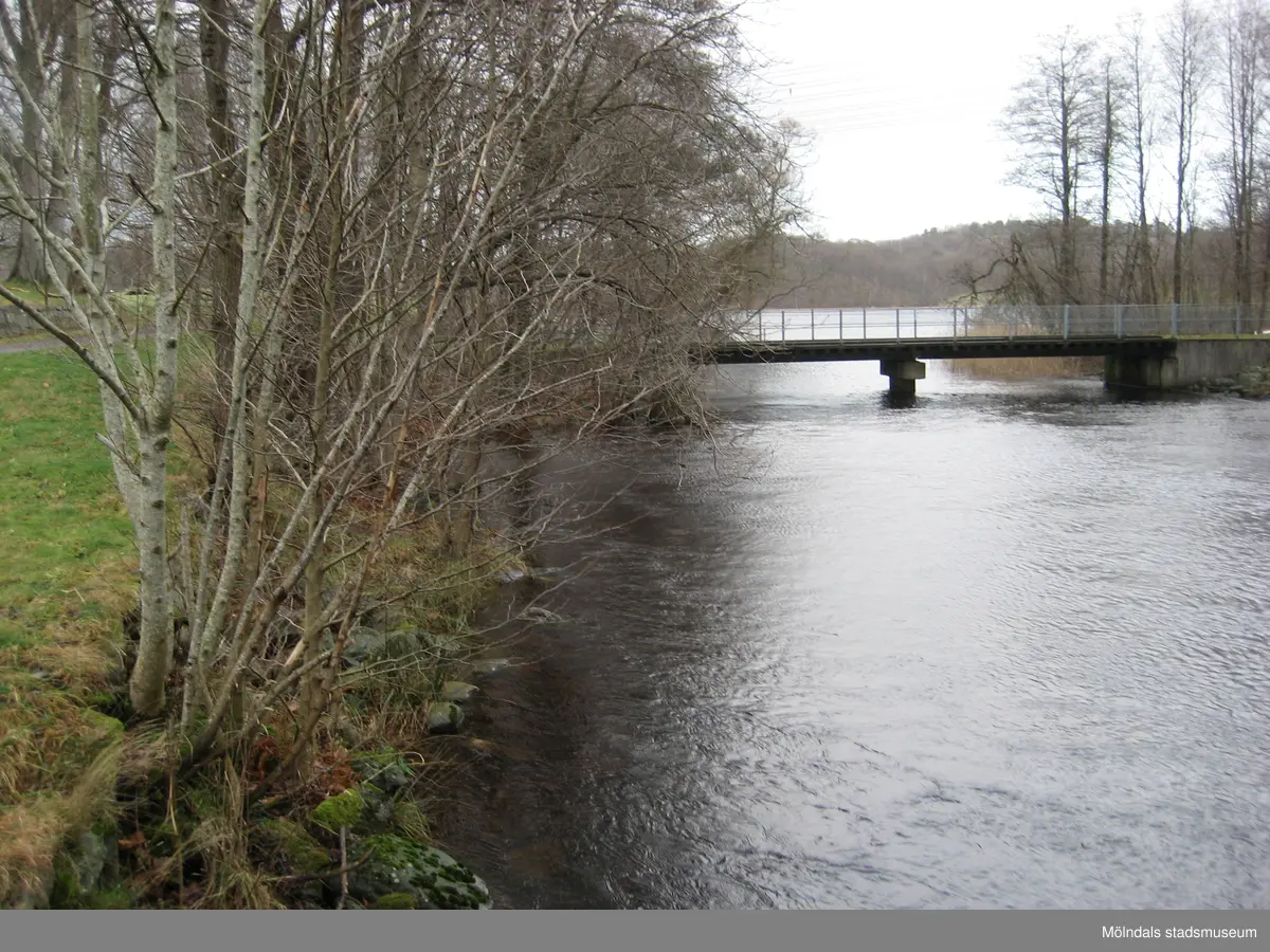 Vy söderut på en gångbro vid Strandgatan i Mölndal år 2011. I bakgrunden ses Stensjön som rinner vidare och bildar Mölndalsfallen. Området är omgivet av mycket växlighet. Dokumentation inför ombyggnation. Relaterade motiv: 2024_1365 - 1412.