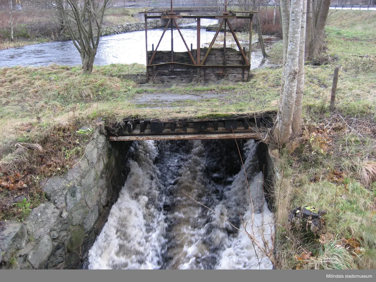 Vy söderut på en dammlucka över Mölndalsfallen, omgivande träd samt dess stensättning, Mölndal år 2011. I fonden ses Strandgatans bro som går från Pixbovägen. Dokumentation inför ombyggnation.