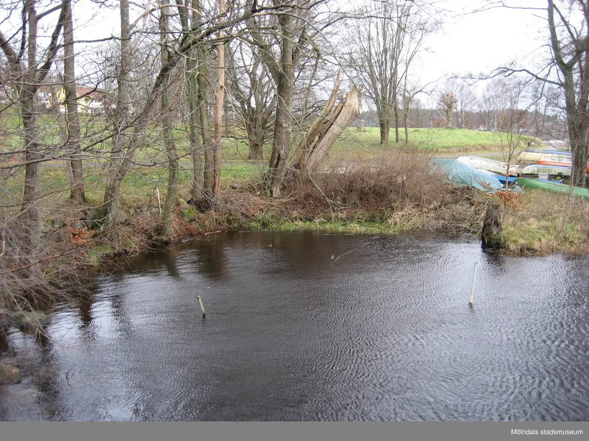 Vy från forsen mot fastigheter i Stensjöhöjd, Grevedämmet i Mölndal år 2011. Vattensamlingen kommer från Stensjön som sedan rinner ner i Mölndalsfallen. Några ekor ligger upplagda på gräset. Området är omgärdat av växtlighet. Dokumentation inför ombyggnation. Relaterade motiv: 2024_1365 - 1412.
