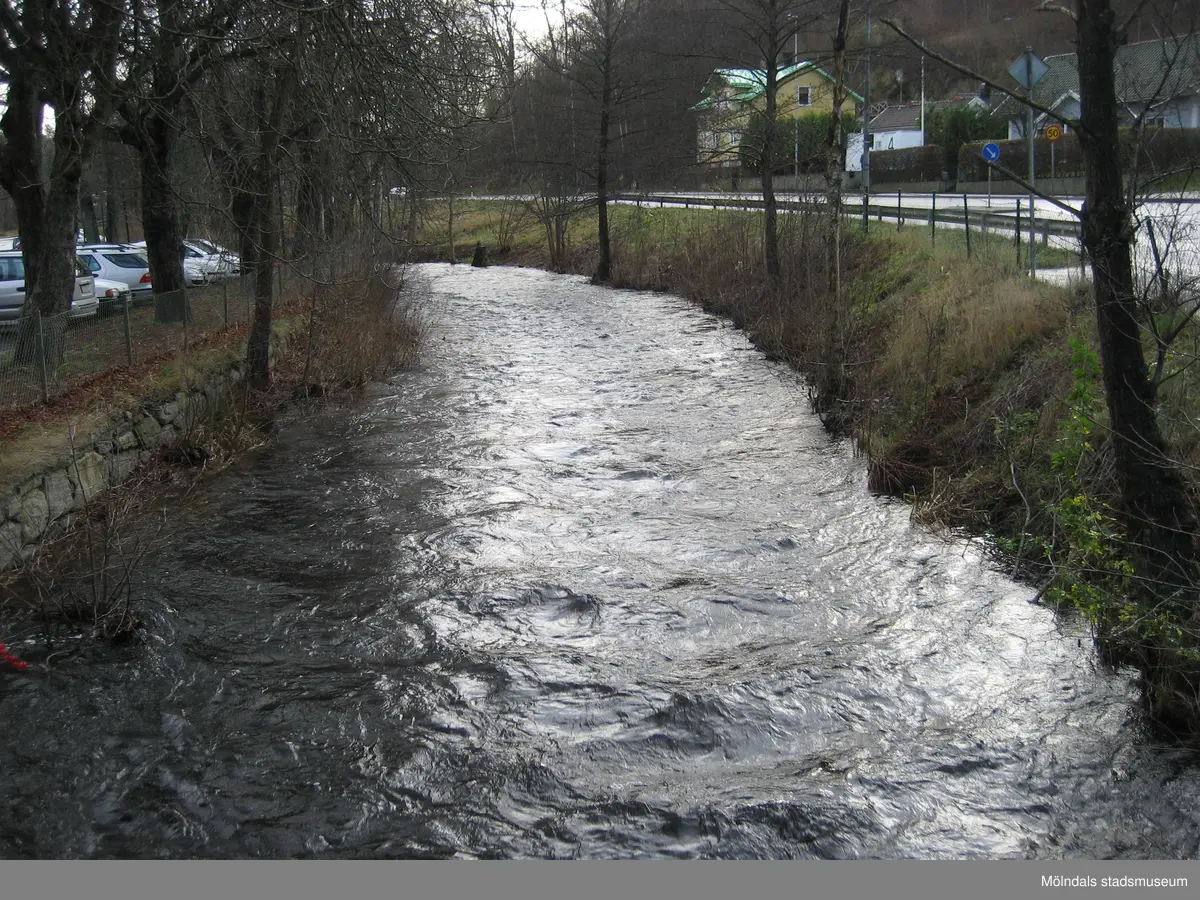 Vy söderut från gångbron Grevedämmetspången över Mölndalsfallen, Mölndal år 2011. Staket sitter utmed forsens båda stensatta sidor. Till vänster ses träd utmed Grevedämmets skolas södra parkering (Pixbovägen 5) och till höger Pixbovägen. De tre villorna närmast till höger (uppifrån räknat) ligger på Sågdalsgatan 6, 4 och 2. Dokumentation inför ombyggnation.
