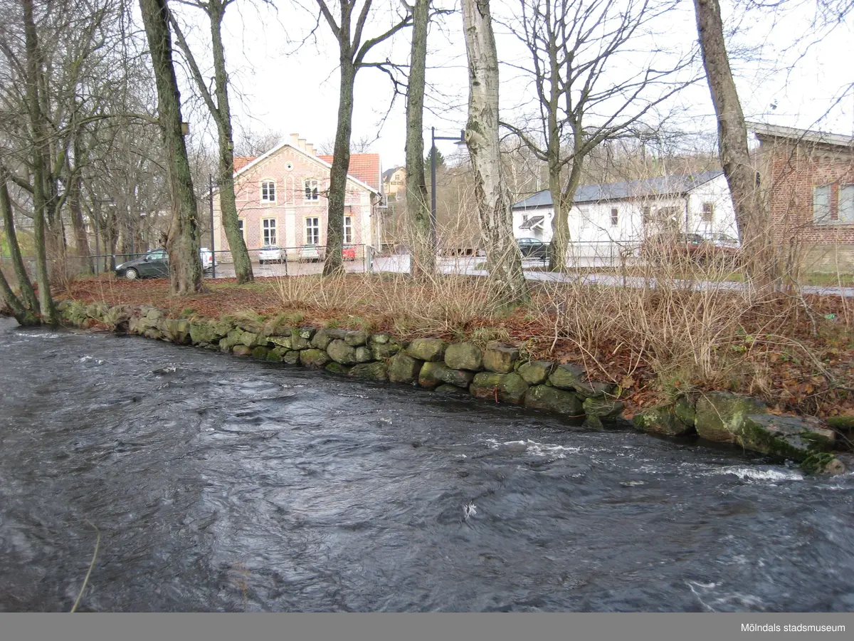 Vy åt nordväst över Mölndalsfallen mot Grevedämmets skola, parkeringsplats med parkerade bilar samt komplementbyggnader, Mölndal år 2011. Dokumentation inför ombyggnation.
