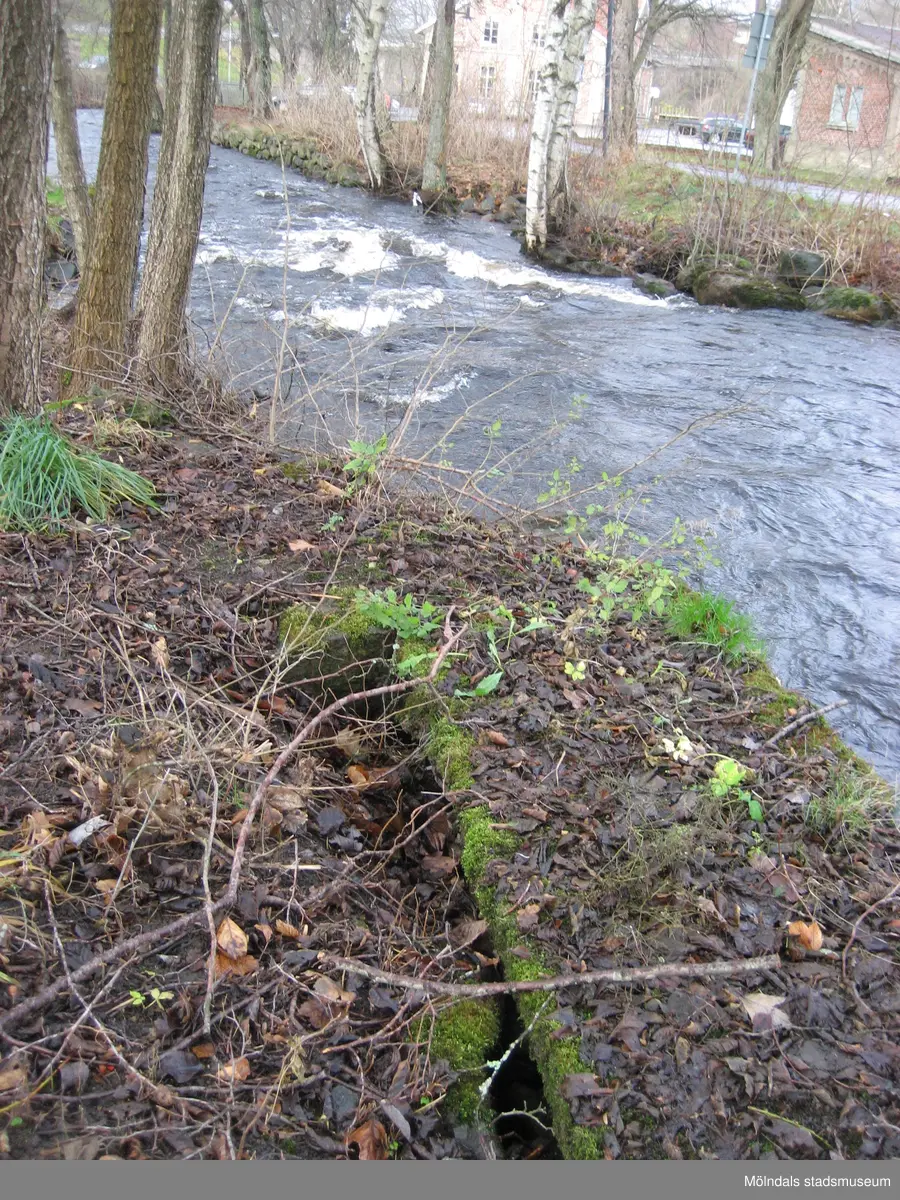 Vy åt nordväst över Mölndalsfallen mot Grevedämmets skola, parkering och komplementbyggnad, Mölndal år 2011. Dokumentation inför ombyggnation.