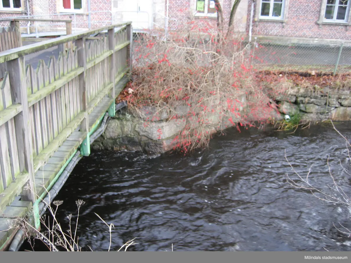 Vy från Pixbovägen på gångbron Grevedämmetspången över Mölndalsfallen och Grevedämmets skola, Mölndal år 2011. Ett staket sitter utmed forsens stensatta sida. Dokumentation inför ombyggnation.