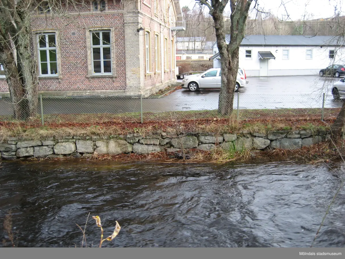 Vy österut från Pixbovägen över Mölndalsfallen samt del av Grevedämmets skola och dess södra parkering med parkerade bilar, Mölndal år 2011. Ett staket sitter utmed forsens stensatta sida. I fonden ses en komplementbyggnad som tillhör samma fastighet. Dokumentation inför ombyggnation.