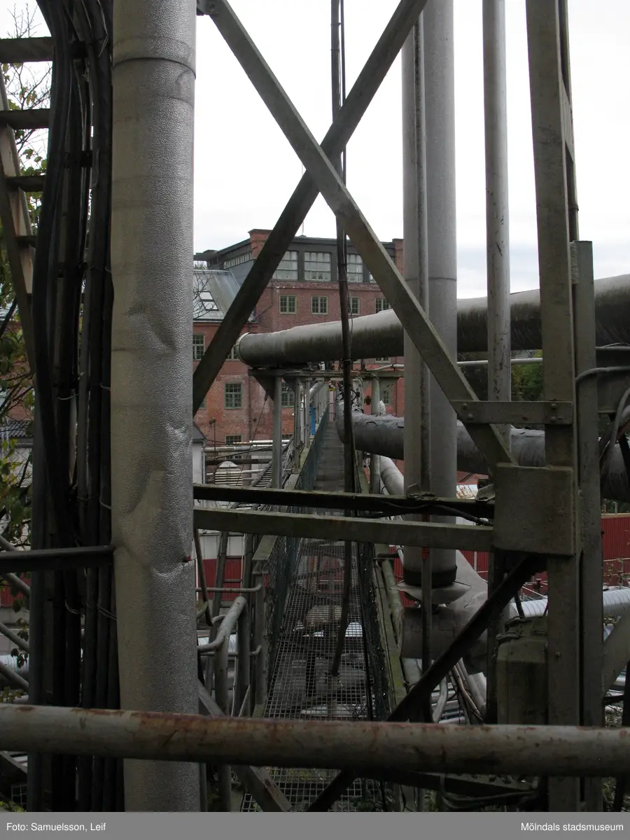 Soabs industrianläggning i Mölndals Kvarnby, år 2007. Rör och brygga över Kvarnbygatan. I bakgrunden Stora Götafors. Anläggningen användes vid fototillfället av Hexion Speciality Chemicals Sweden AB.