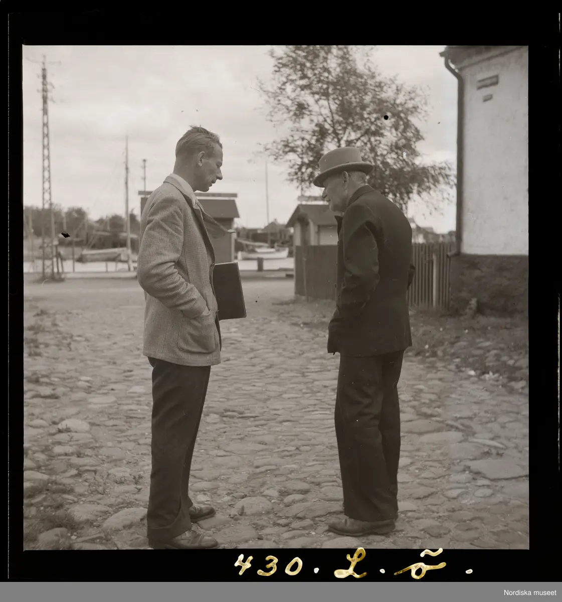 Text på montering i arkivet: Segelsömmare J.P. Jönsson (t.h.) och ingenjör Rosén i samspråk på Partullg.