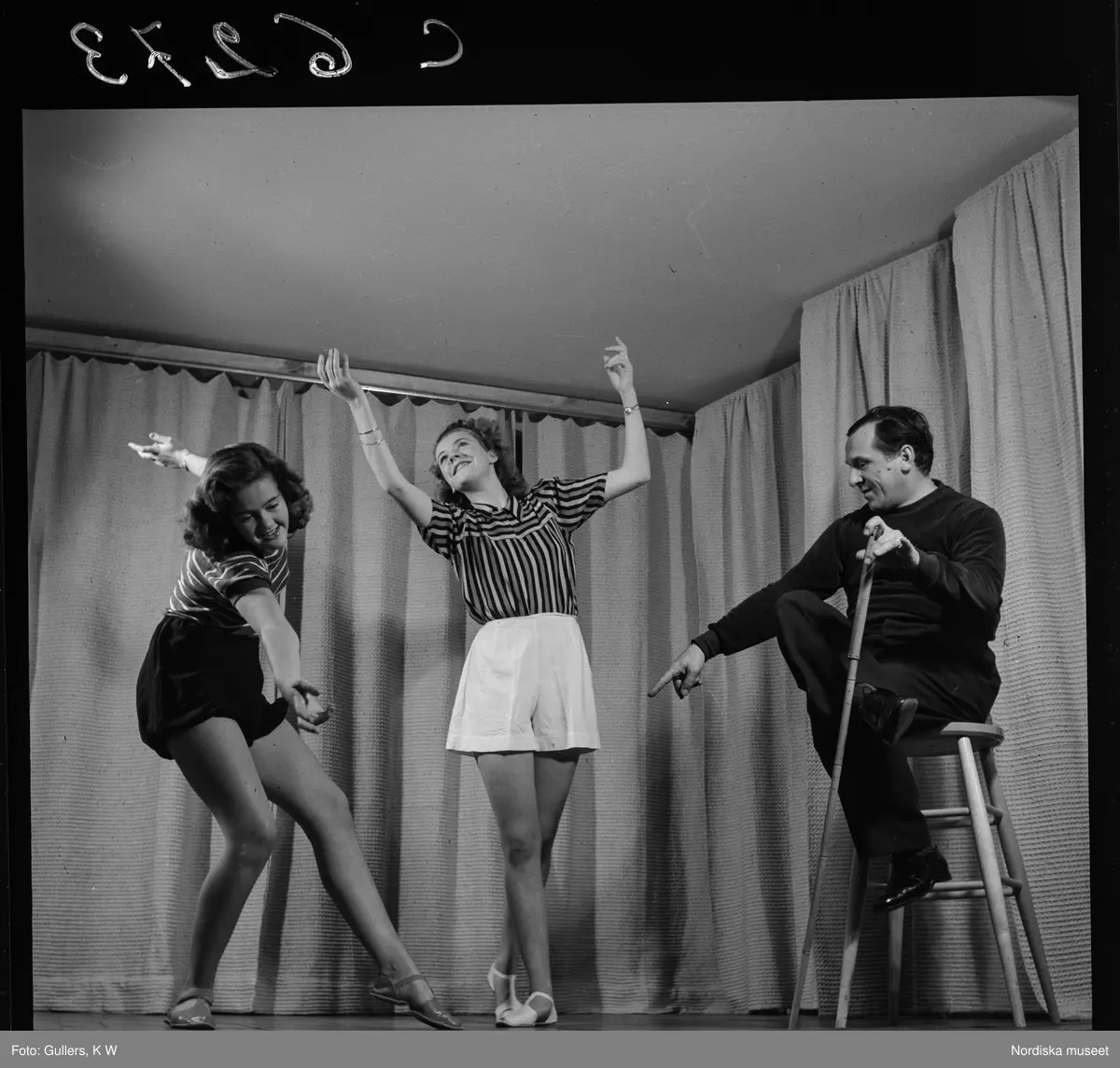 505 Wityansky Teaterskola för Allers. Två kvinnliga teaterelever dansar, en man sitter på en pall med en käpp i handen och instruerar.