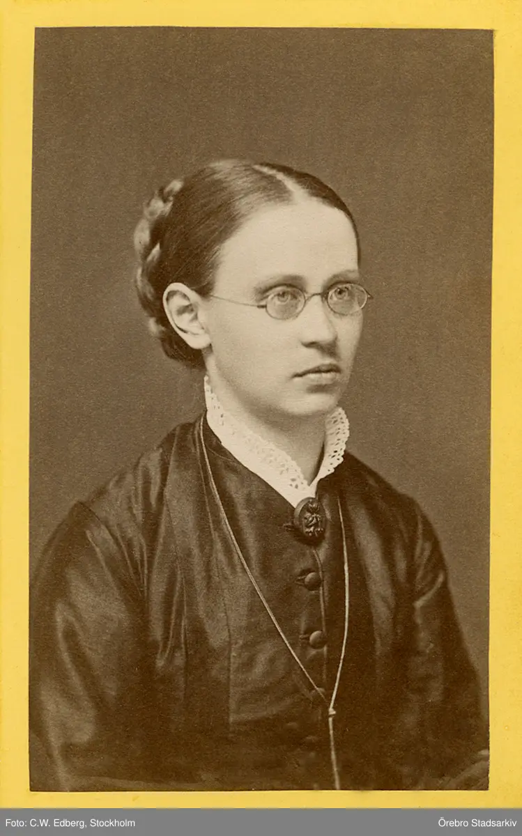 Porträtt av ung kvinna med glasögon och uppsatt hår, 1872