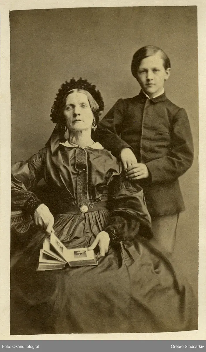 Porträtt av ung pojke som står bakom en äldre kvinna med ett fotoalbum i knät, 1870-tal