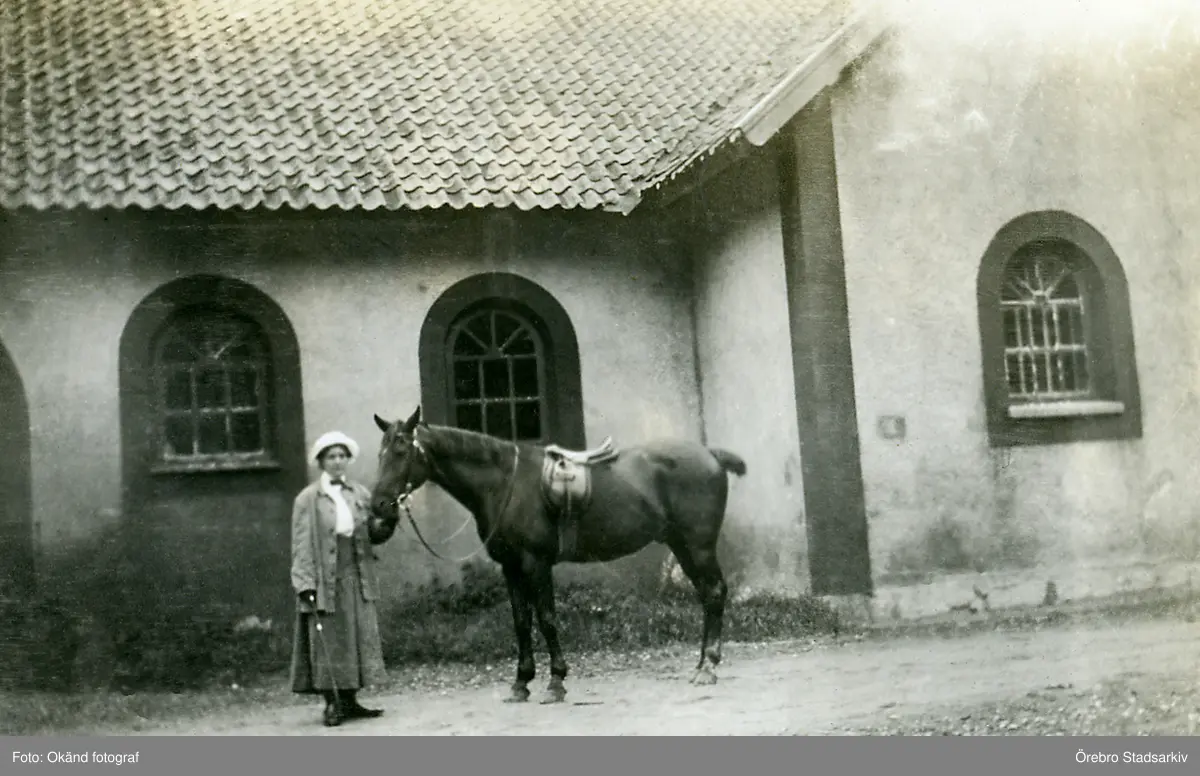 Kvinna vid stallbyggnad på Bystad herrgård, 1910-tal