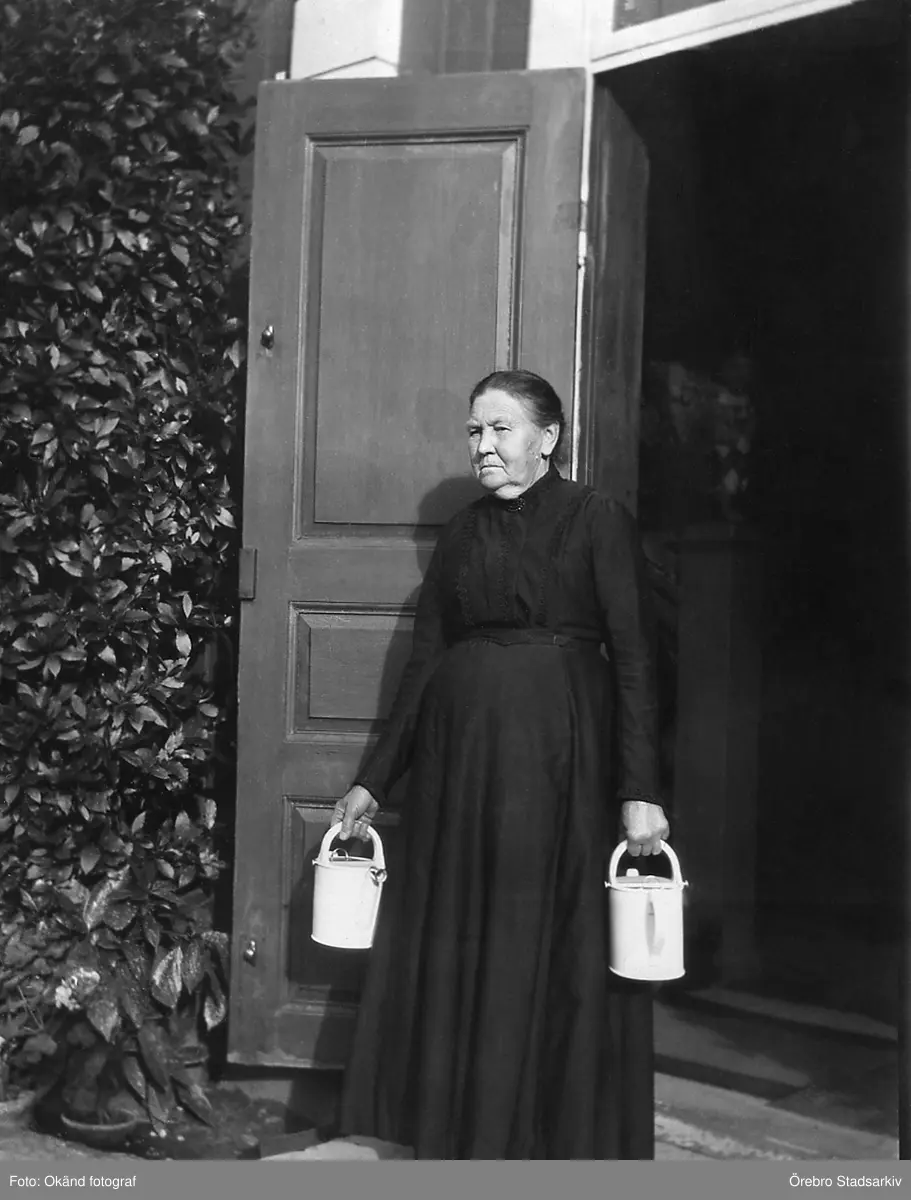 Kvinna med två hinkar vid porten vid Bystad herrgård, 1910-tal