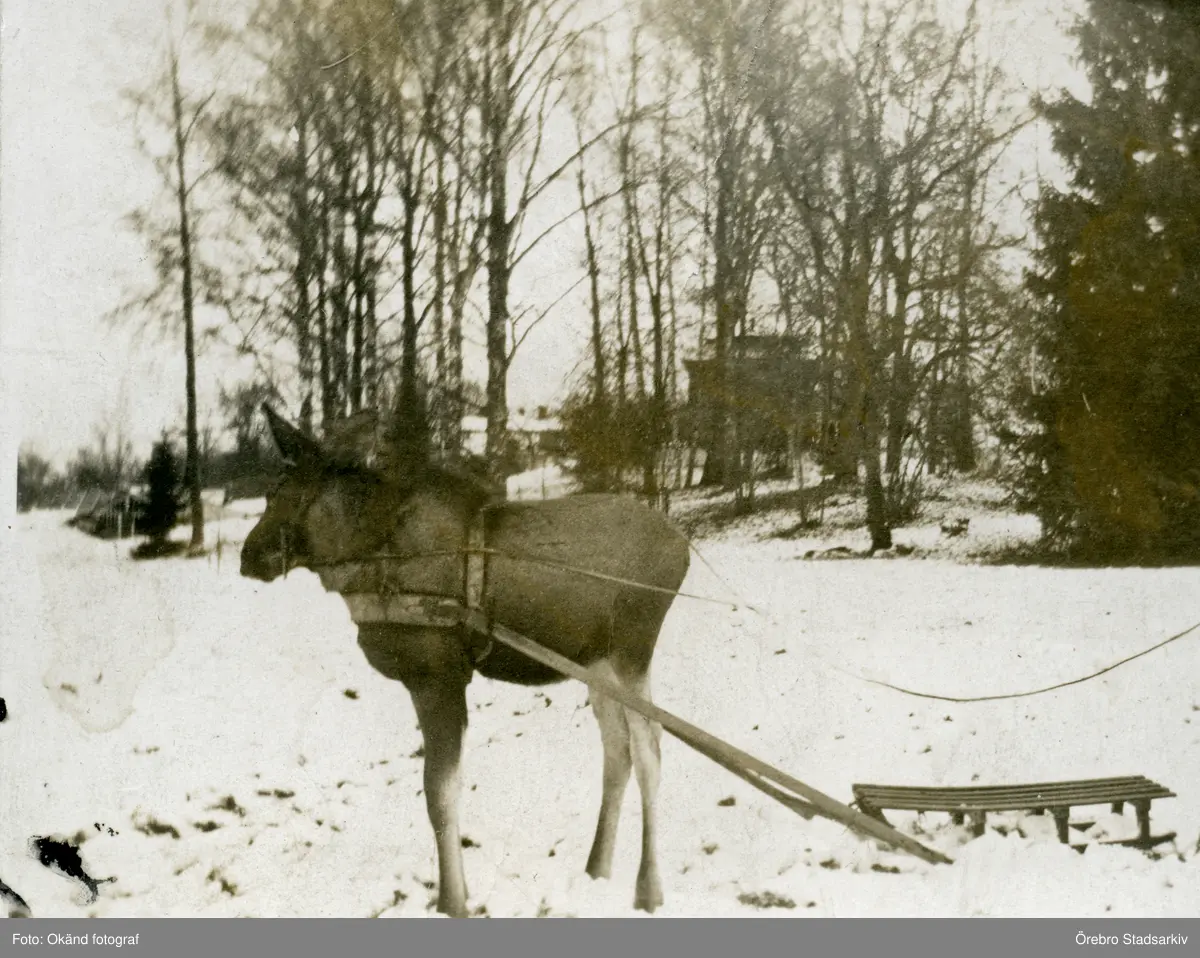 Älgen Kajsa med släde på Färna herrgård, 1913