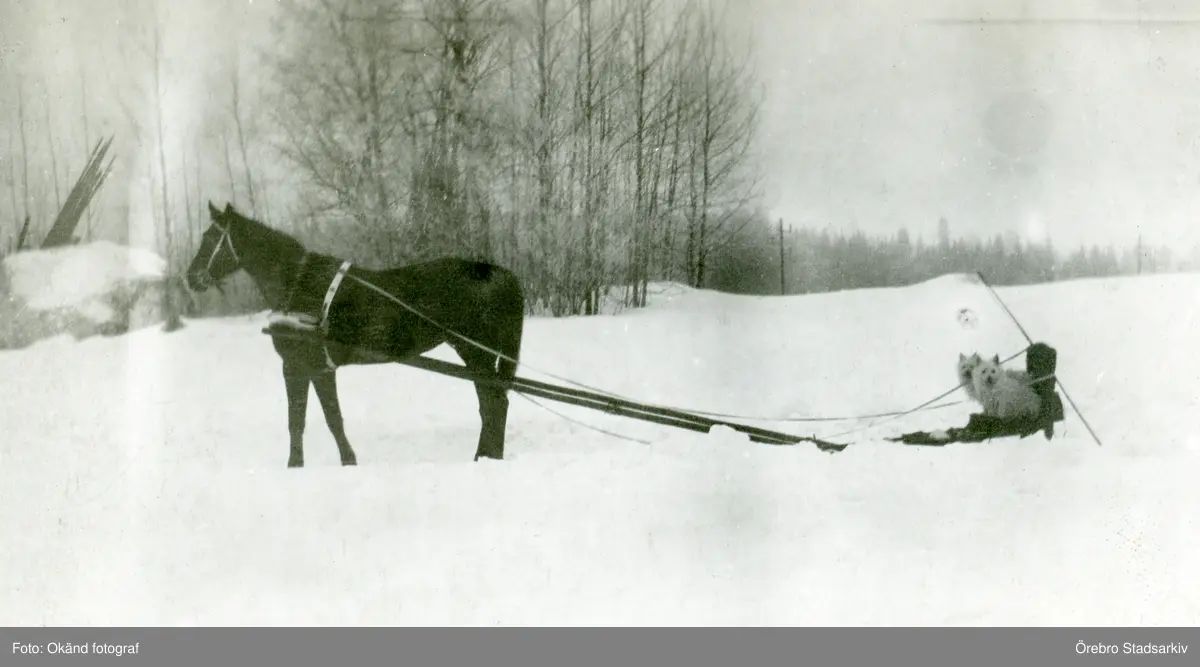 Hundar åker släde i snön på Färna herrgård, 1913