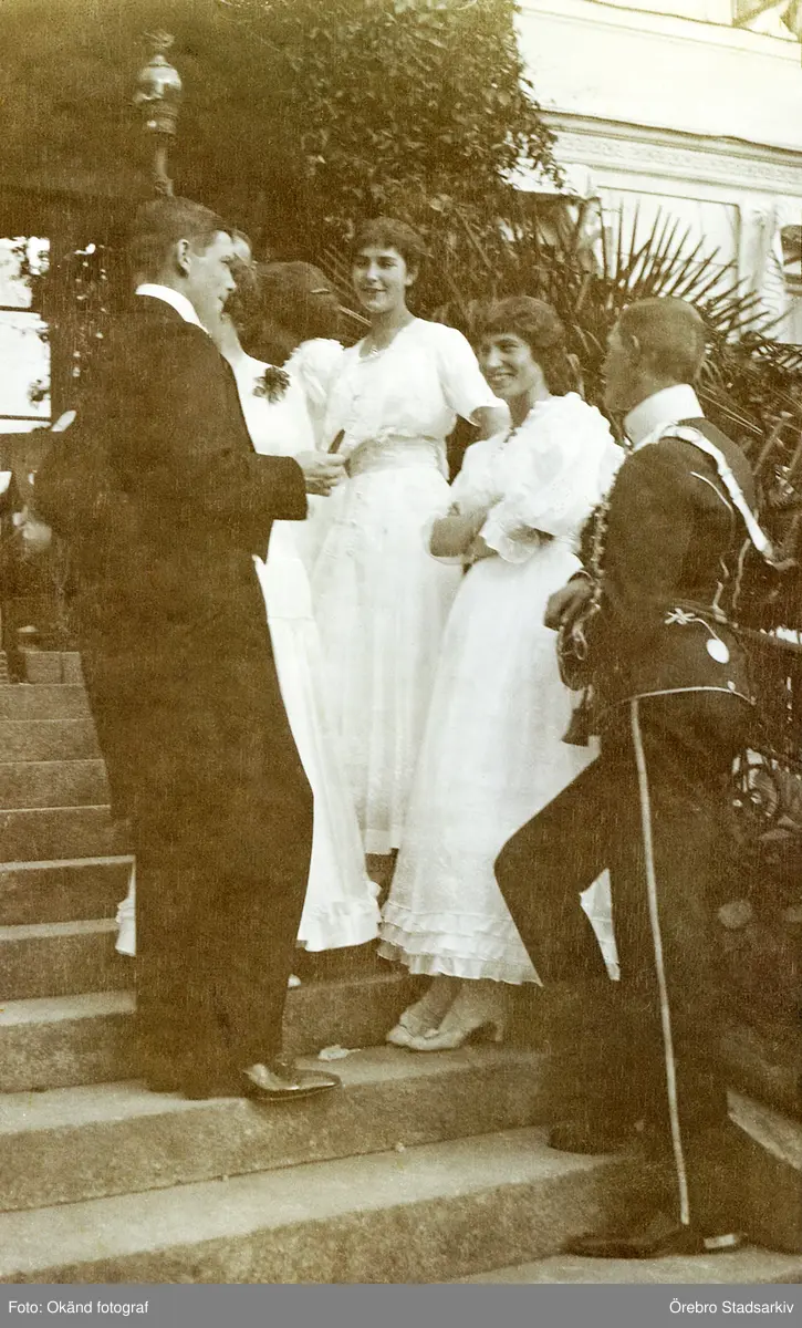 Glada bröllopsgäster på trappan på Färna herrgård, 1915-08-14